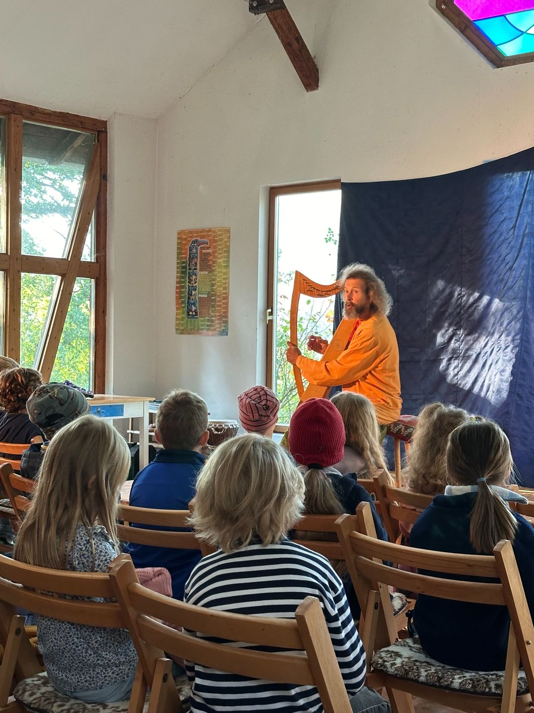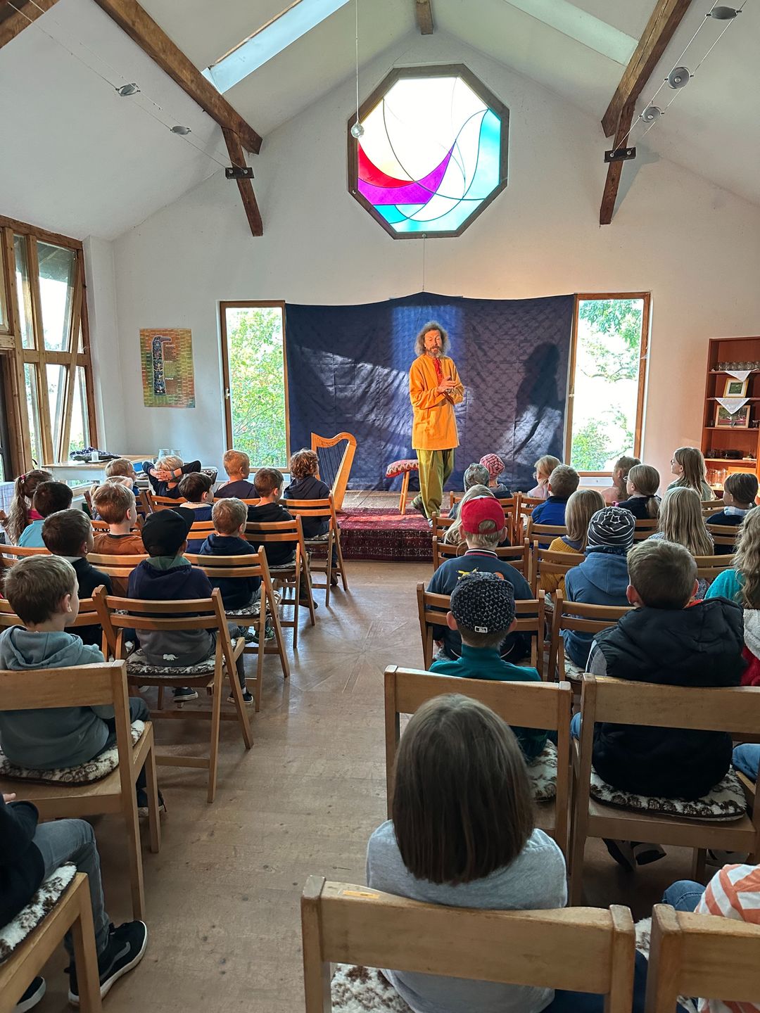 Am Freitag, den 20.09.2024 hat uns der Kinderverein in die "Grüne Harfe" eingeladen. Dort kam Geschichtenerzähler Roland und hat allen Schulkindern in 3 Gruppen Märchen erzählt. Einige bekannte, aber auch weniger bekannte Märchen waren dabei. Die Kinder fanden es sehr spannend. Auch eine echte Spindel und eine Harfe konnten bestaunt werden.