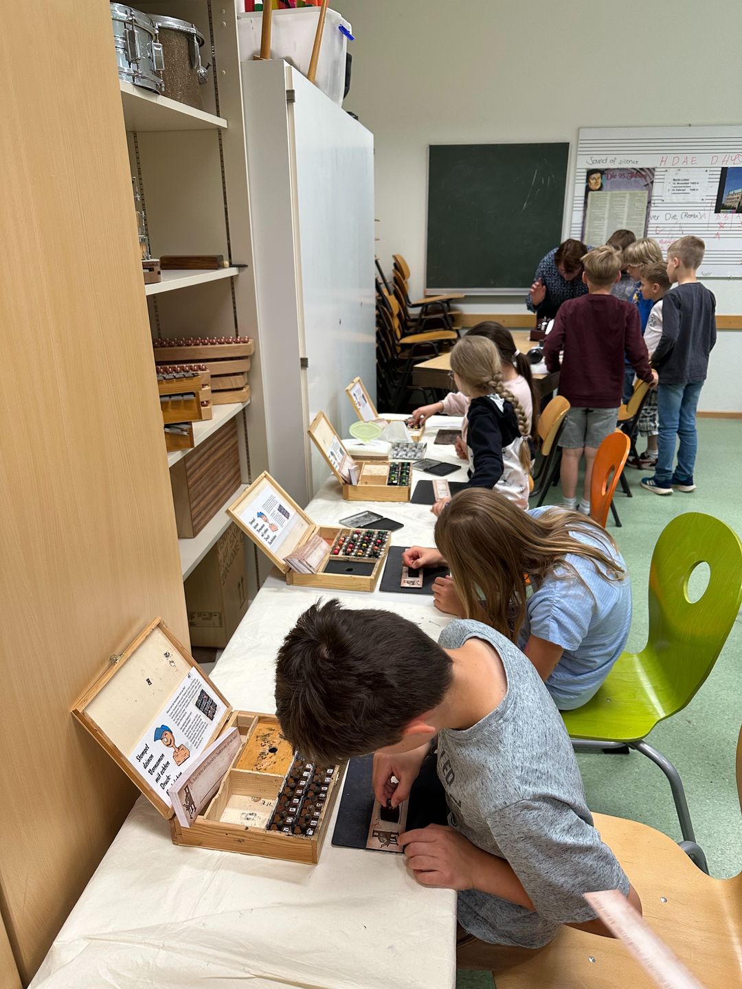 Am 5. und 6. Juni war bei das Ehepaar Schlawer mit ihrer Gutenbergpresse bei uns zu Besuch. Unser gesamter Musikraum war mit den verschiedensten Materialien voll. Die Kinder durften sich selber z. B. eine Seite drucken, mit Lettern ihren Namen stempeln und mit einer Schreibmaschine schreiben.